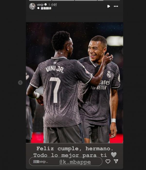 维尼修斯晒出两人合照,并配文:“生日快乐,兄弟。祝你一切顺利@姆巴佩”。